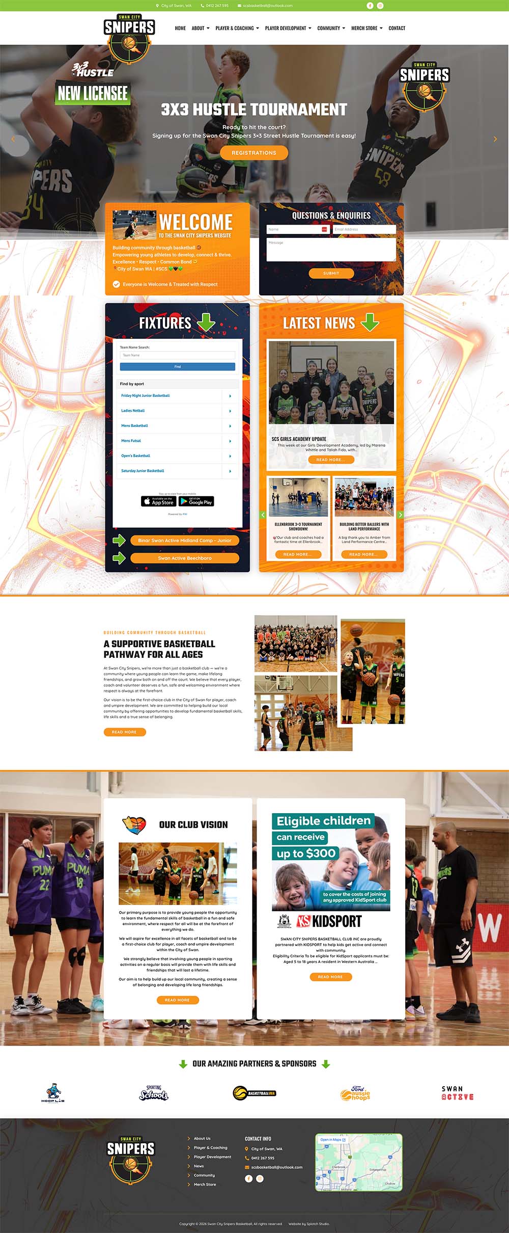 With a modern, user-friendly website designed by Splotch Studio, families and players can now easily learn more about Swan City Snipers Basketball Club’s programs, values, and commitment to developing the next generation of basketball players in the City of Swan.